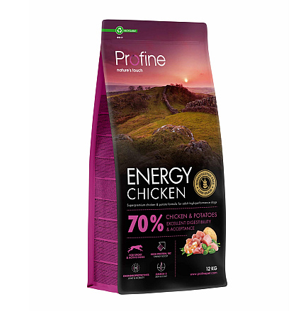 Profine Hondenvoer Energy Chicken is een natuurlijke hondenvoeding op basis van kip en aardappel die speciaal ontwikkeld is voor volwassen honden die hoge prestaties leveren.