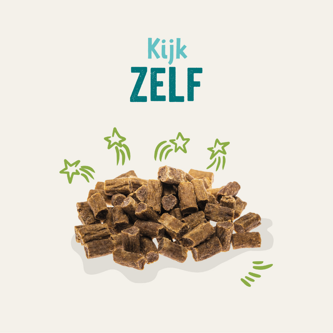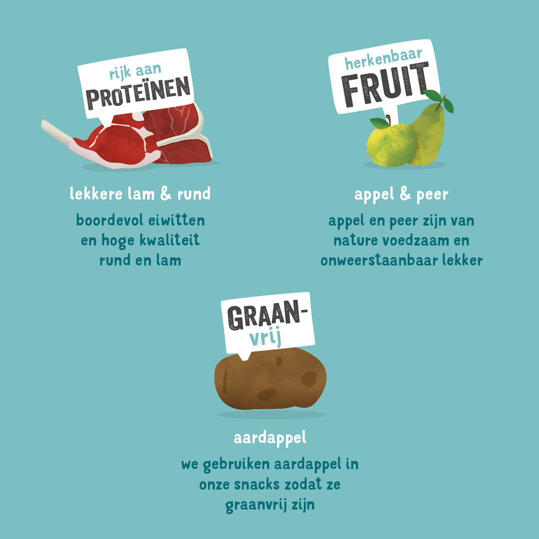 Graanvrije en vetarme beloningskoekjes met onweerstaanbaar lekker vlees en fruit.