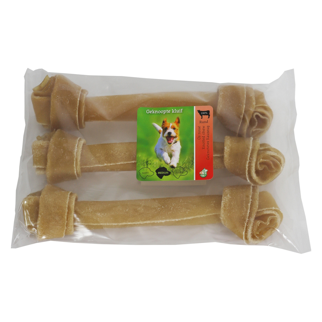 Dit geknoopte bot is gemaakt van 100% rauwe, gedroogde runderhuid en is een gezonde snack voor honden.