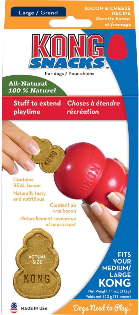 Kong Snacks bacon & cheese zijn smakelijke koekjes met spek- en cheddarsmaak gemaakt met natuurlijke ingrediënten en zonder tarwe, mais of soja.