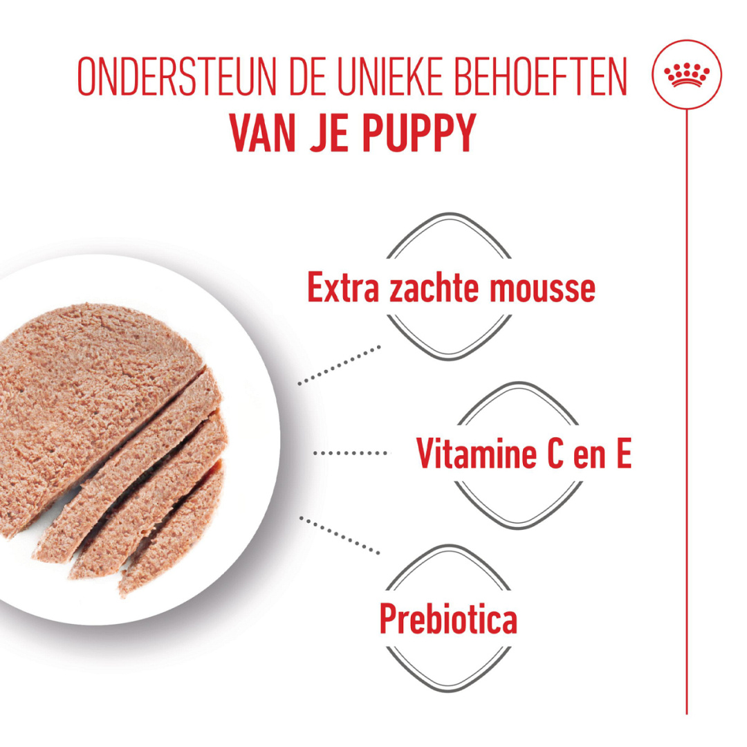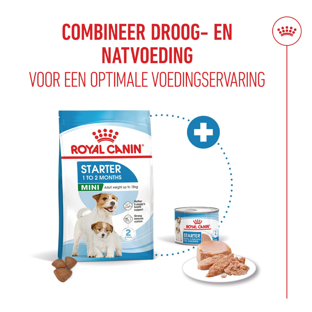Royal Canin Starter Mousse Mother & Babydog bevat alle voedingsstoffen die nodig zijn ter ondersteuning van moederhonden en haar pups tijdens de dracht en de zoogperiode. Doordat het een hoog eiwit-, energie- en mineralengehalte bevat is Royal Canin Starter Mousse Mother & Babydog zeer geschikt voor puppy’s tijdens het spenen en de eerste 2 maanden van hun leven.