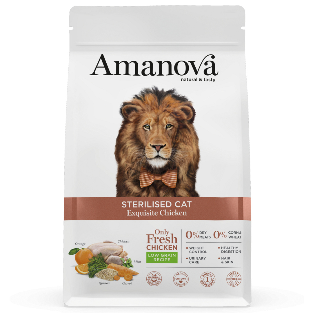 Amanova Sterilised Exquisite Chicken kattenvoer is een heerlijke, zorgvuldig samengestelde maaltijd voor volwassen gesteriliseerde katten van alle rassen. Deze super premium kattenvoeding is hypoallergeen, bevat een laag gehalte aan granen en is bereid met uitsluitend verse en smaakvolle kip.