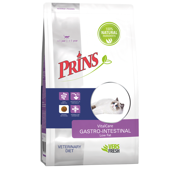 Prins VitalCare Veterinary Diet Gastro-Intestinal Low Fat is een krokante dieetvoeding voor volwassen katten ter ondersteuning van de spijsvertering. Ook geschikt bij acute diarree of tijdens de daaropvolgende herstelperiode.