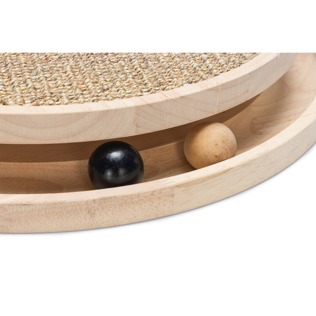 Designed by Lotte krabpaal Zavi draagt niet alleen bij aan het verzorgen van de nagels van jouw kat, maar is ook nog eens te gek om mee te spelen. Dit komt doordat er in de bodem van de krabpaal een sleuf is gemaakt waarin drie speelballetjes verwerkt zitten. Zodra jouw kat tegen de balletjes aantikt zullen deze gaan rollen. Daarnaast zit er aan de paal zelf een touw bevestigd met veer en speelballetje.