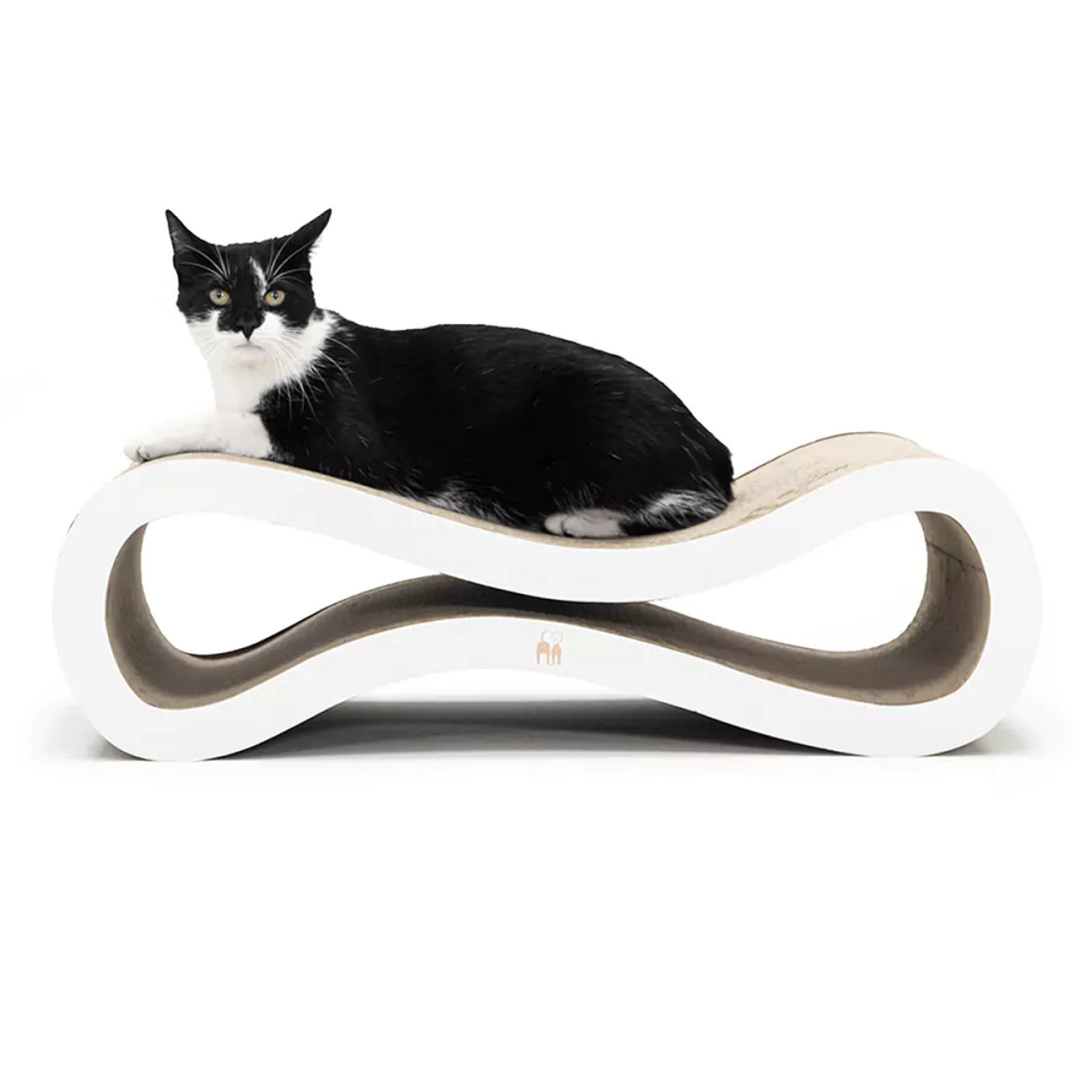 Multifunctioneel krabmeubel van karton in een sierlijk zandlopervorm. Afm. 75 x 32 x 23 cm.