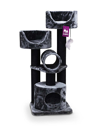 Compacte en sterke krabpaal met drie dikke stammen, 2 divans met uitneembaar kussen, slaapruimte en een speeltunnel. Afm. 48,5 x 48,5 x 125 cm.