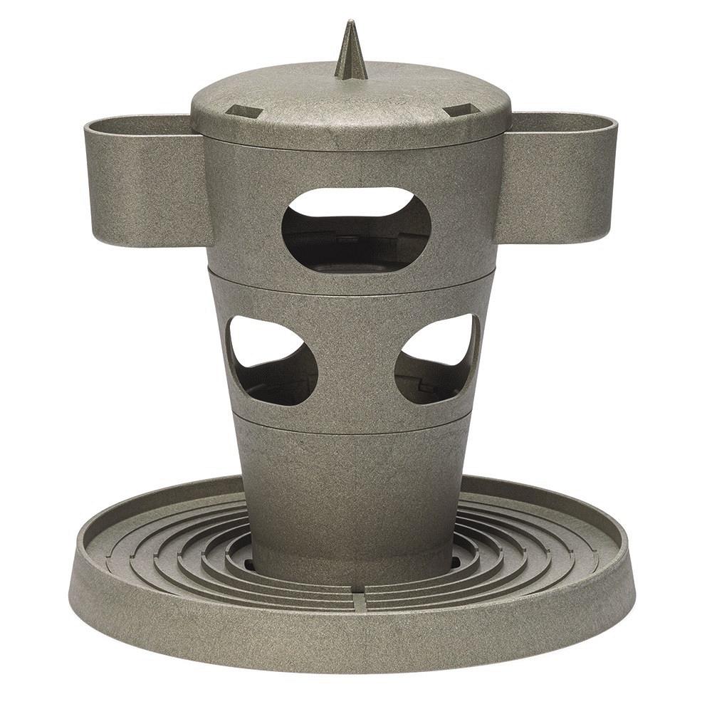 Aan de zijkanten van de snacktoren bevinden zich twee bakjes, waar je ook iets lekkers in kan stoppen. Voor het afvoeren van regenwater is de bodemplaat van de toren voorzien van een afwateringskanaal. Tevens bevinden zich in de bodemplaat 4 kleine gaatjes zodat je de toren vast kan zetten in de grond. De snacktoren kan worden gereinigd in de vaatwasser op eco-stand. De snacktoren is ecologisch verantwoord, deze is namelijk gemaakt van 100% gerecycled plastic afkomstig van ca. 132 drinkpakken.
